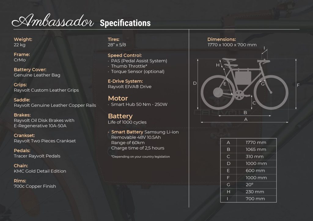 Neoclassical Spirit, Classic, yet far from conventional. Ambassador is the most aristocratic aesthetics bike that Rayvolt has designed to date. Delicately strong, this model combines a retro and neoclassical look with a focus on the details. This puts the bike in a class of its own that offers the perfect product for users who like traditional bicycles.