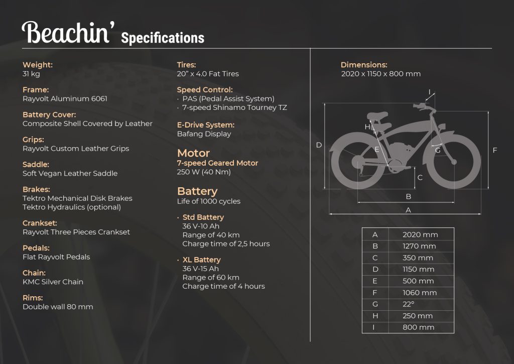 Cool and sexy, the Beachin’ is Rayvolt’s electric beach cruiser bike. A large and muscle e-bicycle for the beach and outdoor adventure lovers. Its fat tyres are perfect for cruising on the beach sand or riding dirt roads. Despite its dimensions, it remains a stable and very manoeuvrable electric bike.